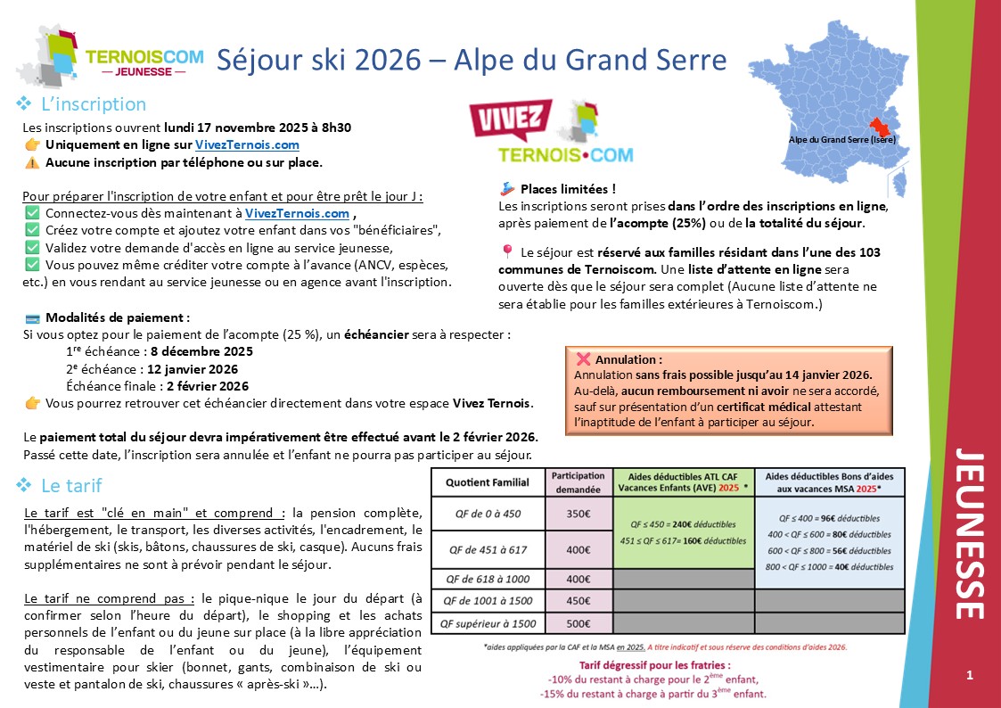 ![]() | SEJOUR HIVER – FEVRIER 2026Les inscriptions ouvrent lundi 17 novembre 2025 à 8h30